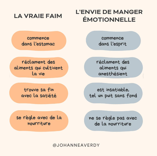 Enfin, dernière raison qui explique pourquoi tu as du mal à écouter ta faim : tu confonds la vraie faim (la faim physiologique) avec la fausse faim (la faim émotionnelle).