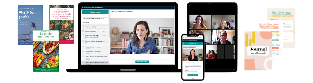 Suis le programme à ton rythme, depuis ton ordinateur, tablette ou smartphone. Chaque leçon présente une notion fondamentale du programme (la faim, la satiété, la gestion du stress ou encore la gestion des émotions) + un exercice concret à mettre en œuvre dans la foulée. Les leçons sont publiées très progressivement (un module tous les 15 jours), ce qui te laisse largement le temps nécessaire pour intégrer et appliquer les consignes. Tu bénéficies d’un accès à vie à tous les contenus.