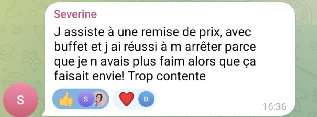 Par ailleurs, le programme inclut une communauté d’entraide privée : il s’agit d’un chat privé sur Telegram (une application gratuite très similaire à WhatsApp mais respectant davantage la confidentialité). Tu vas pouvoir connecter avec les autres participantes, célébrer tes victoires et demander du soutien.